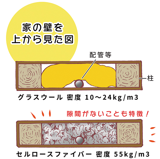 いくら断熱性能値が高い断熱材を使用しても、断熱欠損が多くなってしまう断熱材では、性能値をうまく発揮することはできません。高い密度でしっかりとした断熱性能値を発揮できるのが「セルロースファイバー」の強みなのです。