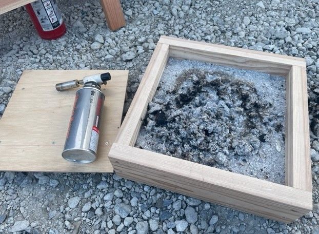 防火実験では、バーナーでセルロースファイバーを燃やします。